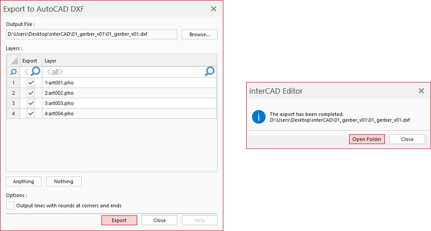 이런 경우를 위해 interCAD Editor에서는 Gerber 파일을 DXF로 변환시켜줄 수 있는 기능을 지원하고있습니다.